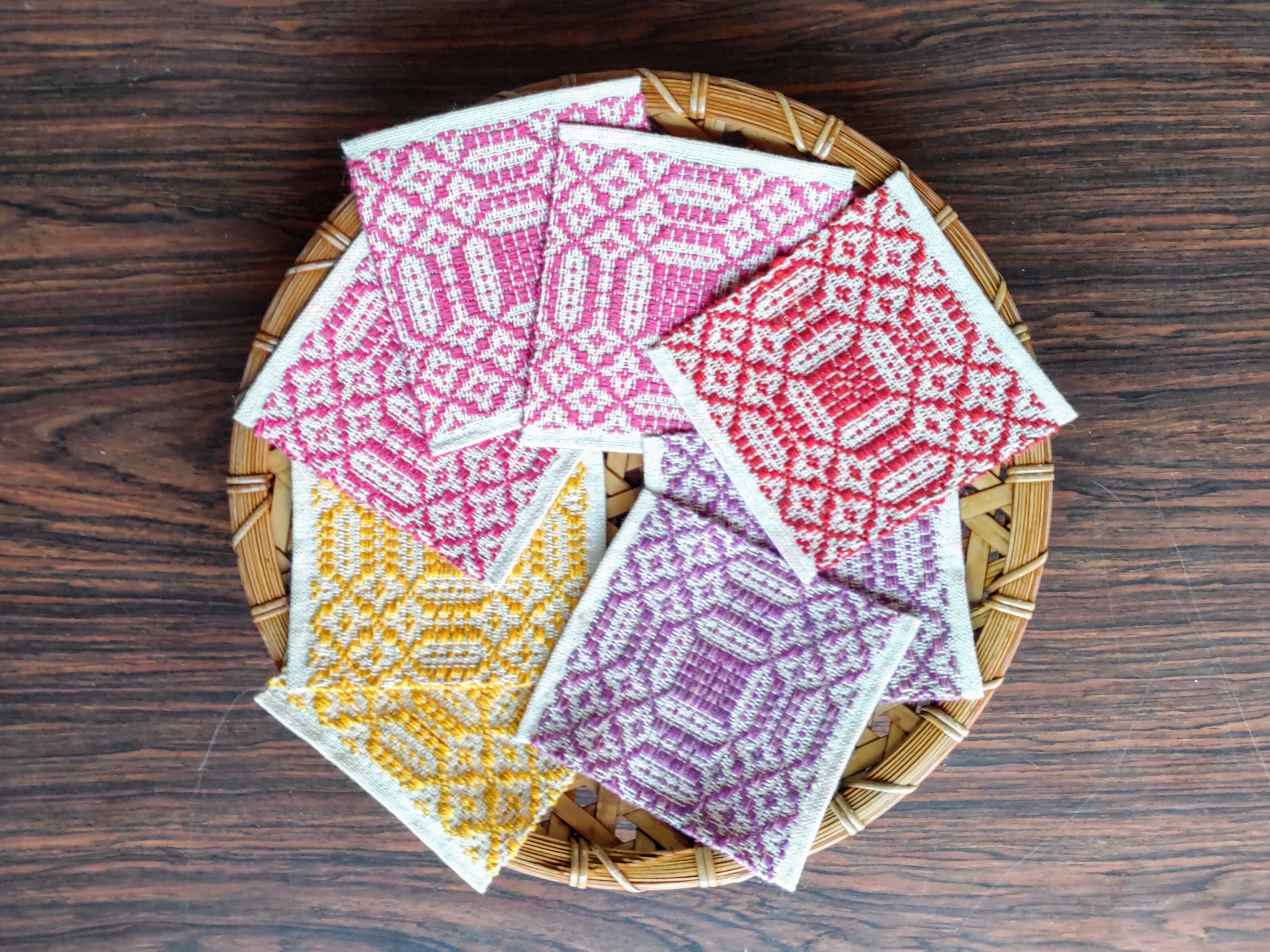 お茶の時間を楽しく演出する「オーバーショット・コースター」は、手織り模様が個性的なアイテムです。
