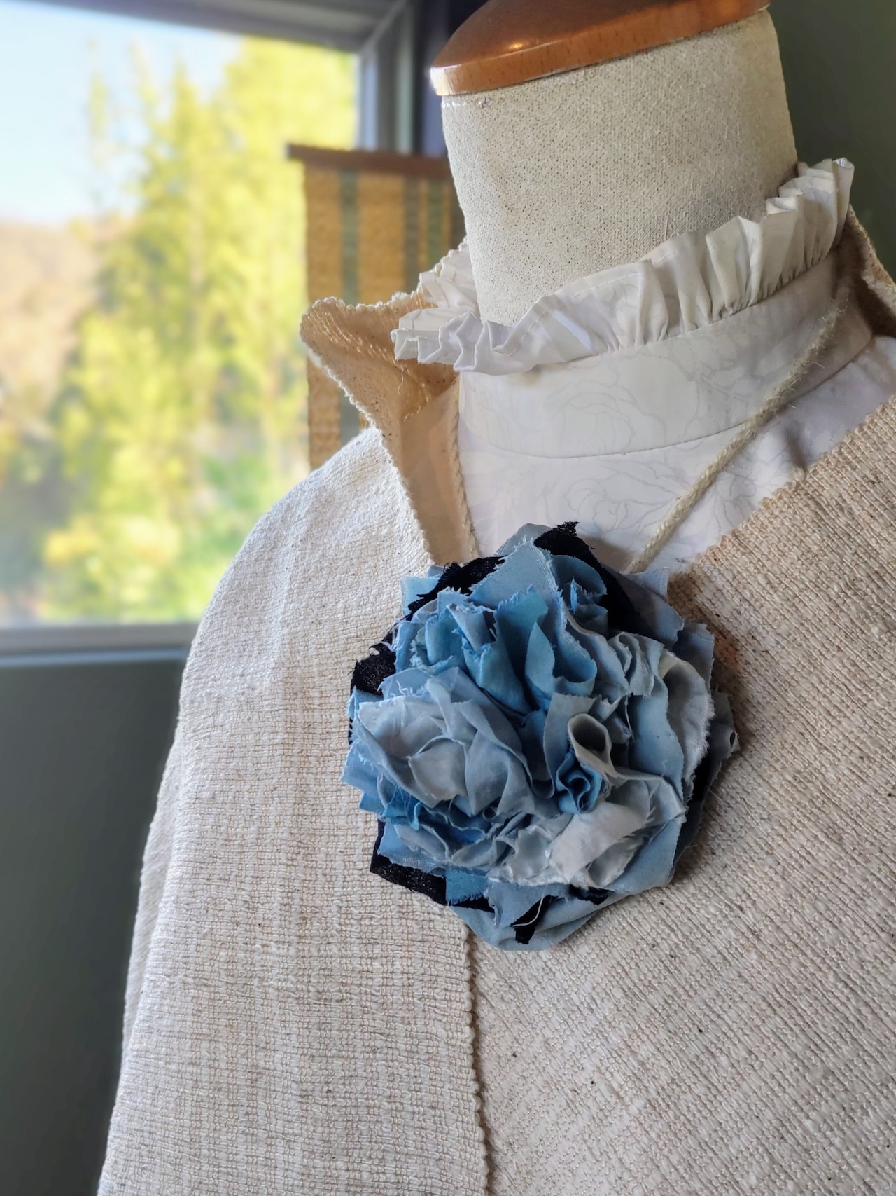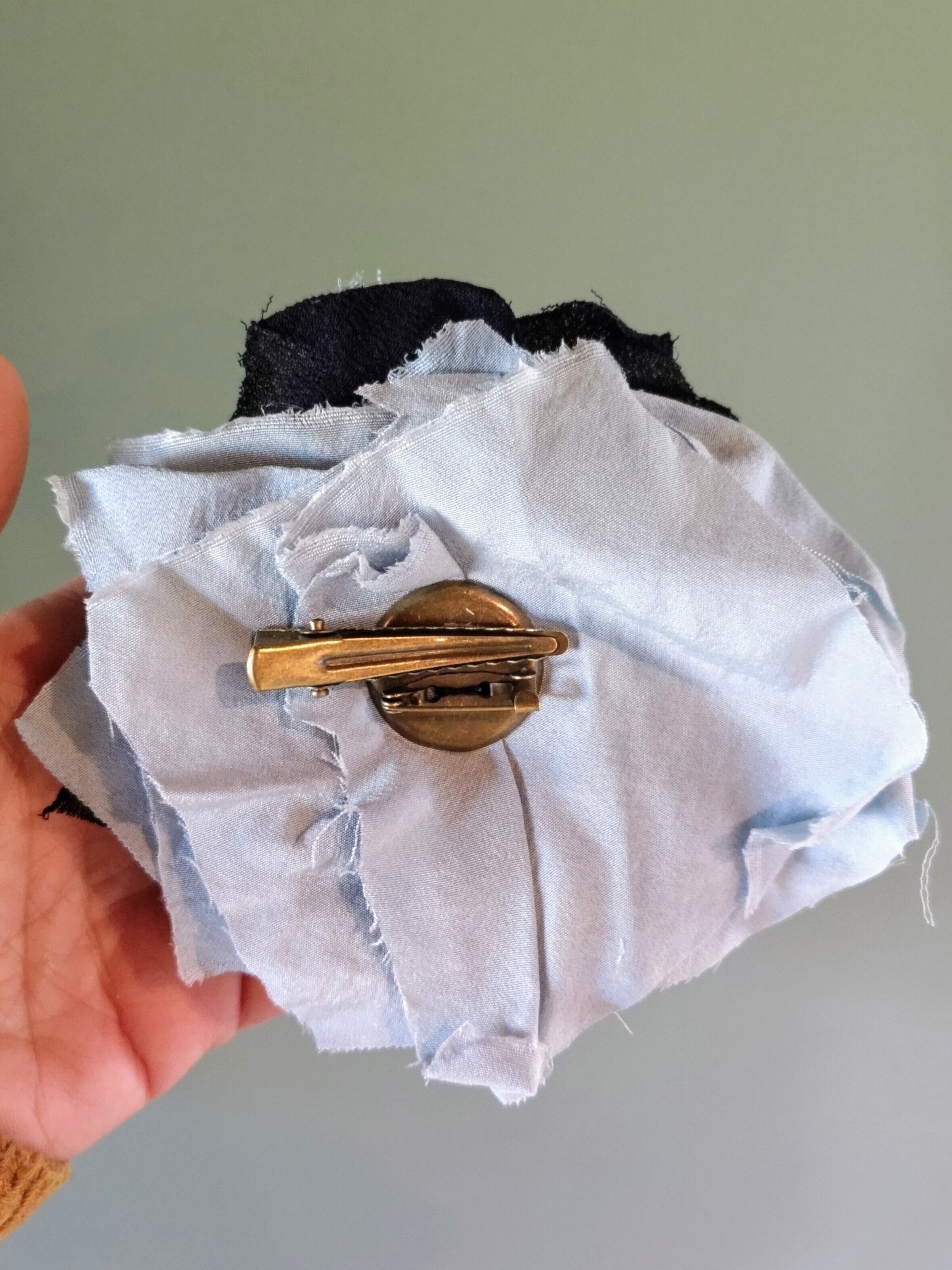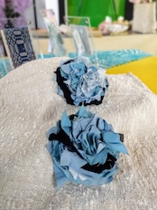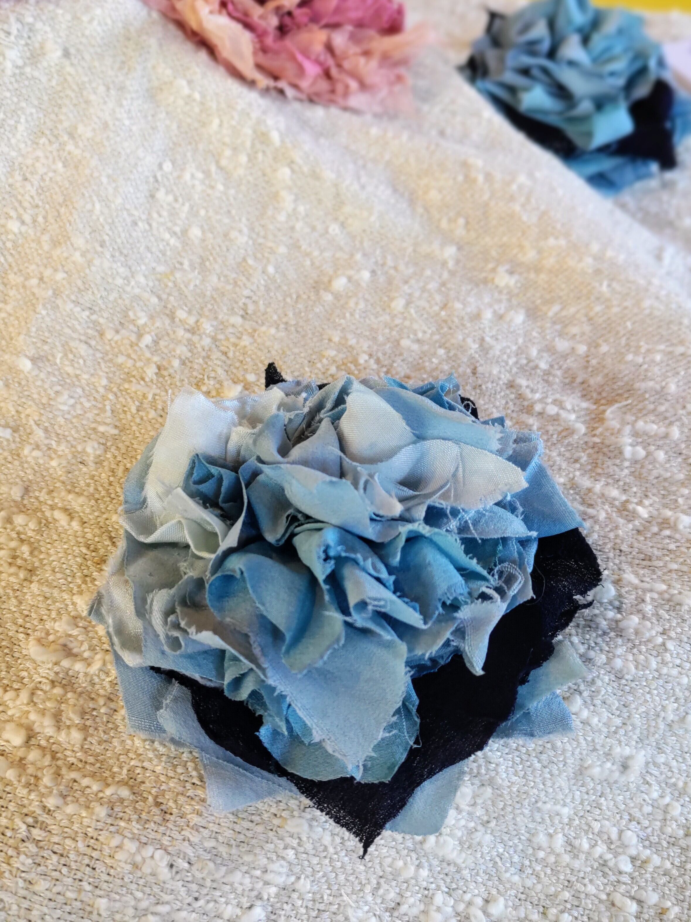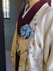 このコサージュは、ブルー系の美しい色合いが魅力のアイテムです。絹の生地を使用し手染めで仕上げており、独特の風合いとともに他にはない個性を引き立てます。ウエディングや特別なイベント、日常のコーディネートのアクセントとしても最適です。