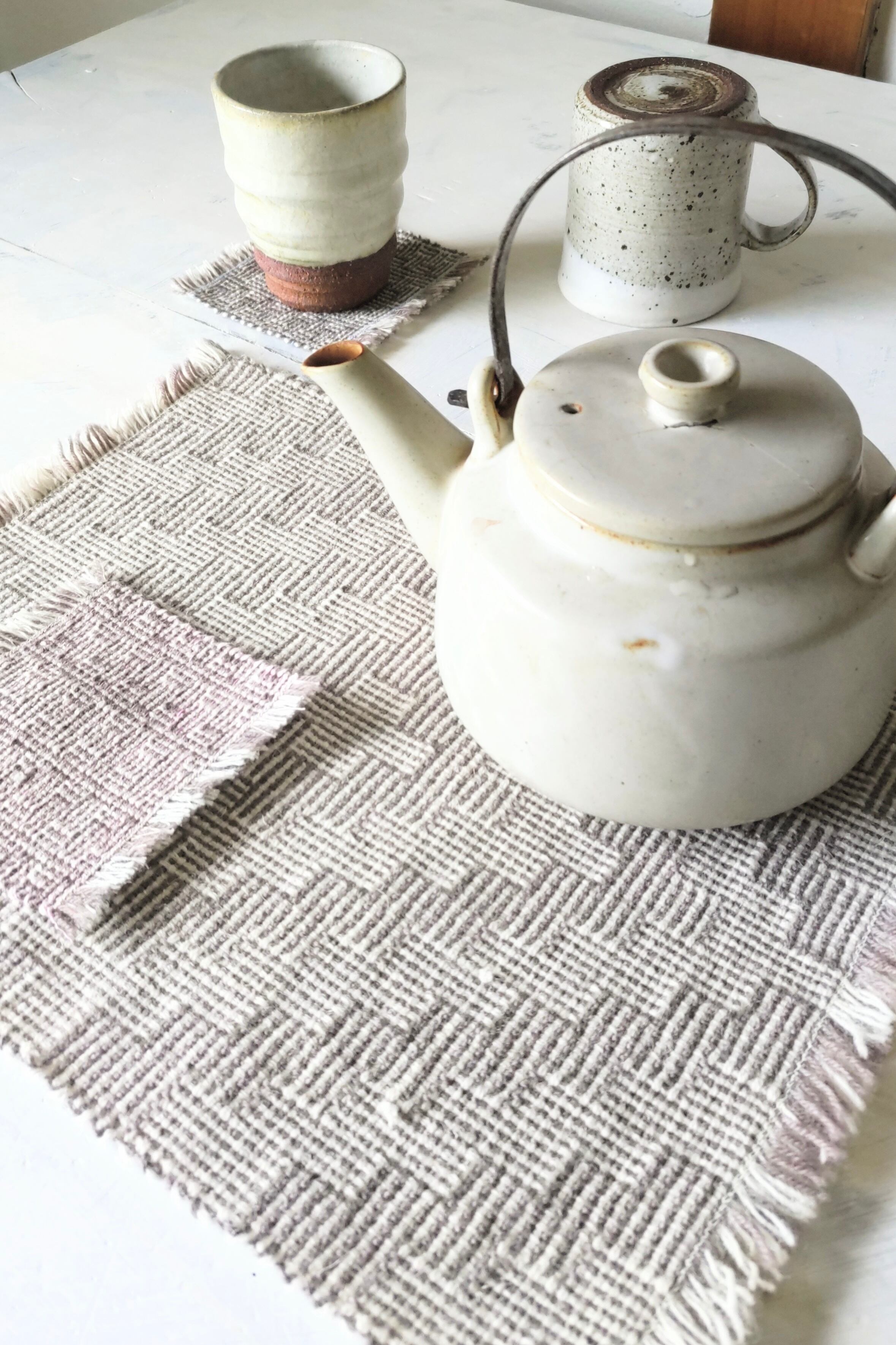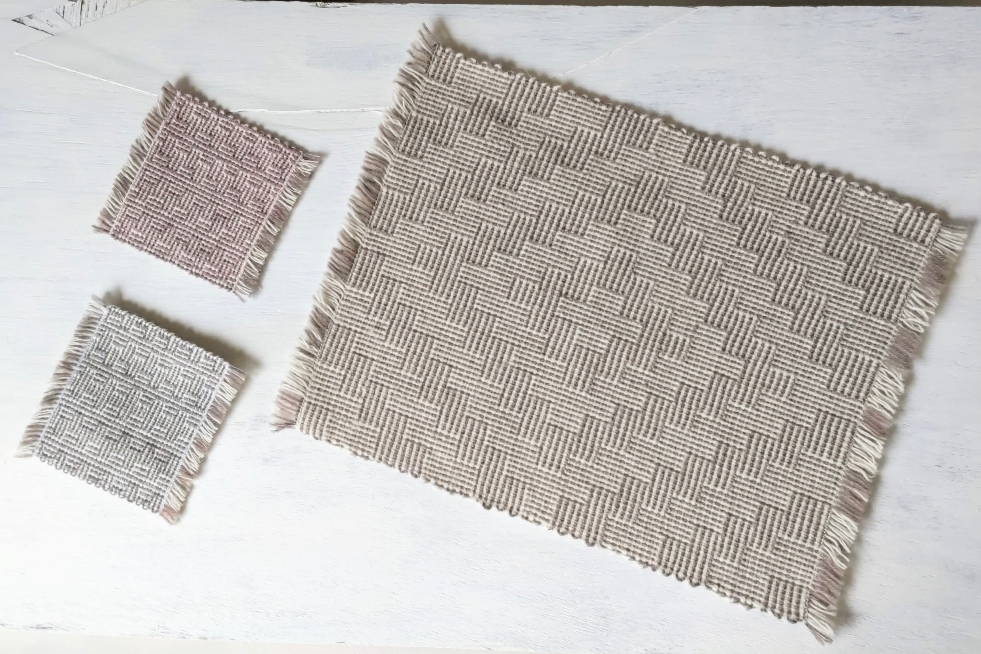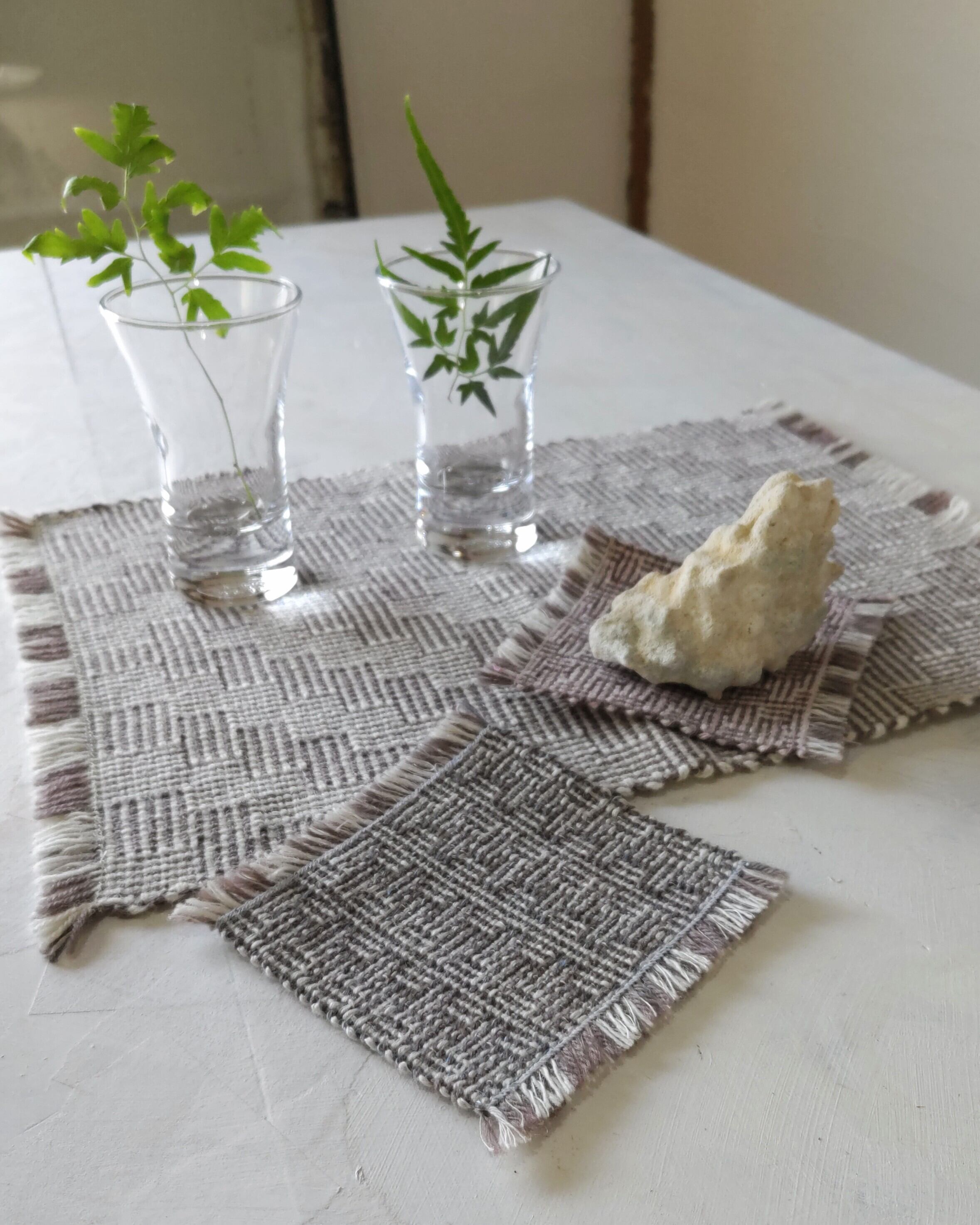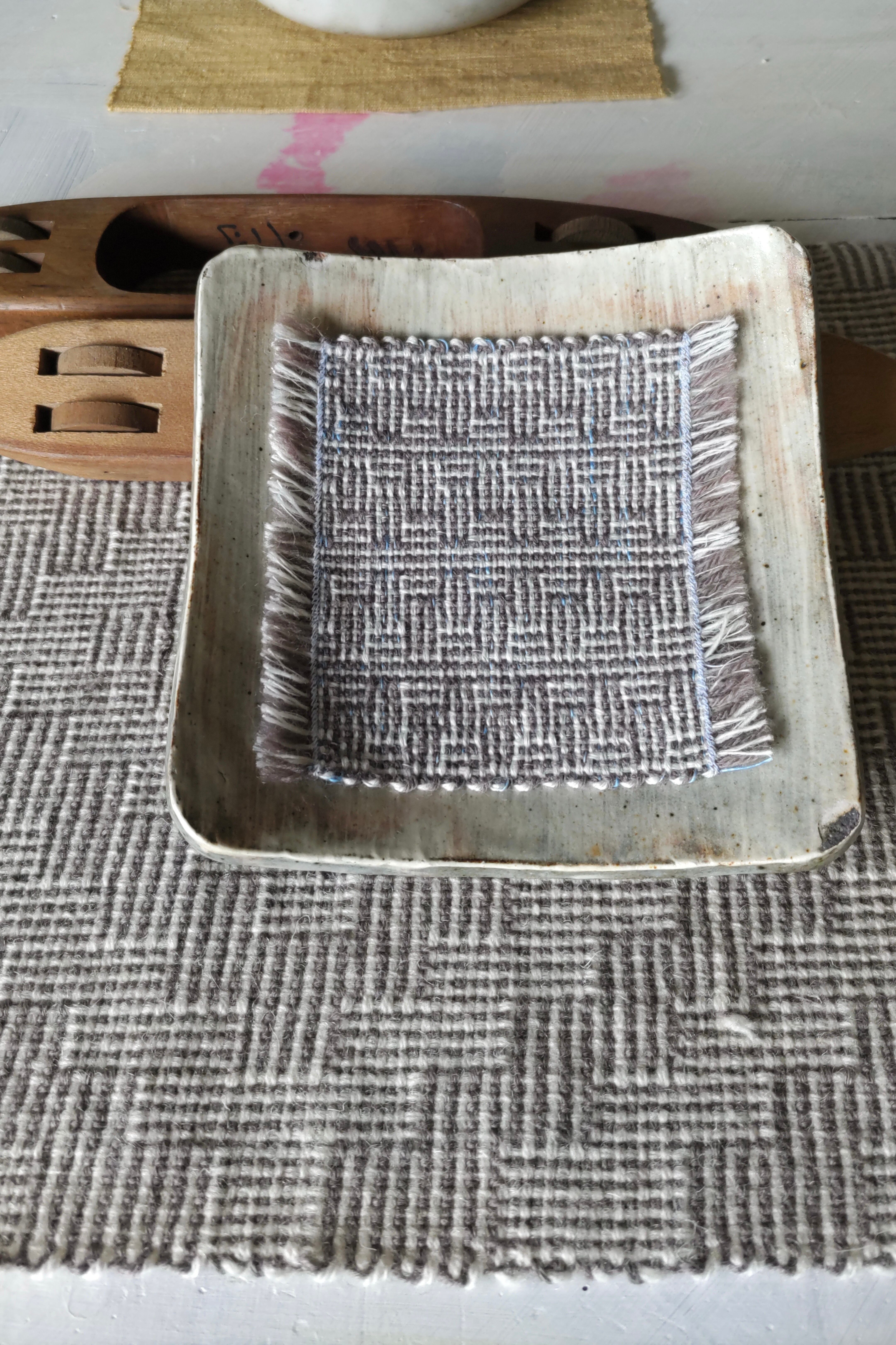 シャドーウィーブと呼ばれる特殊な技法を使用した、手織りのコースターとテーブルマット。シャドーウィーブ独特の質感には、どこか不思議な存在感があります。