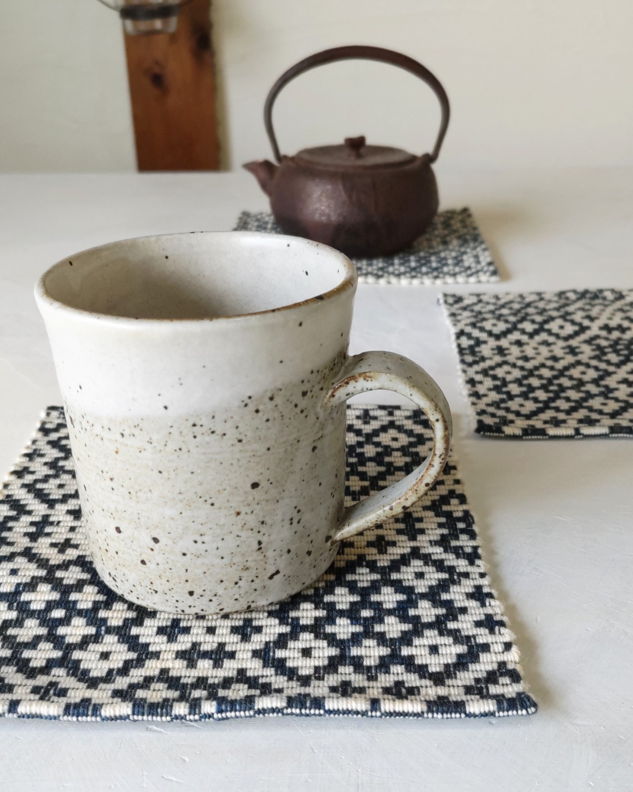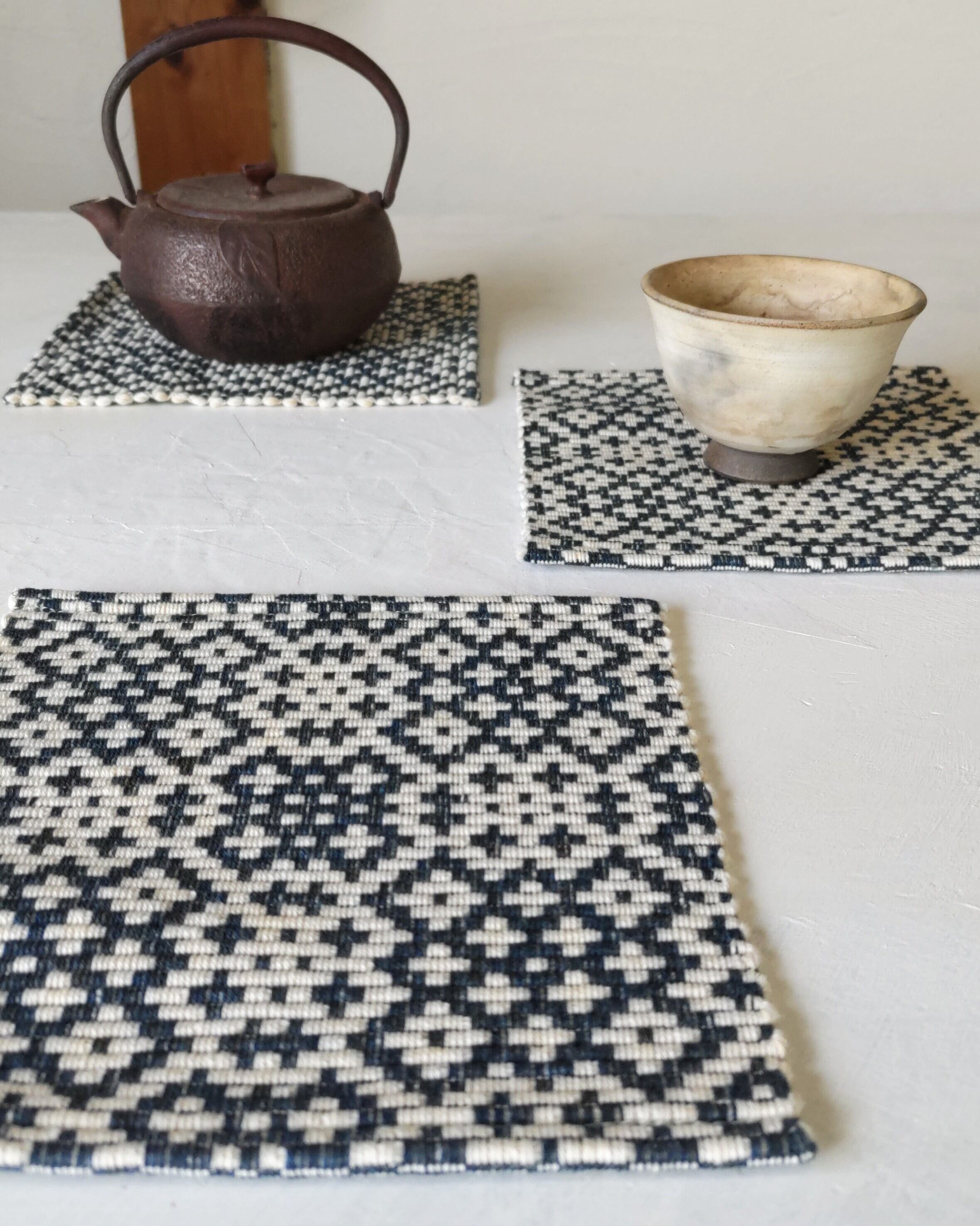 藍染めと生成りホワイトによるスッキリとした印象のポットマット。食器を選ばず活躍してくれます。
