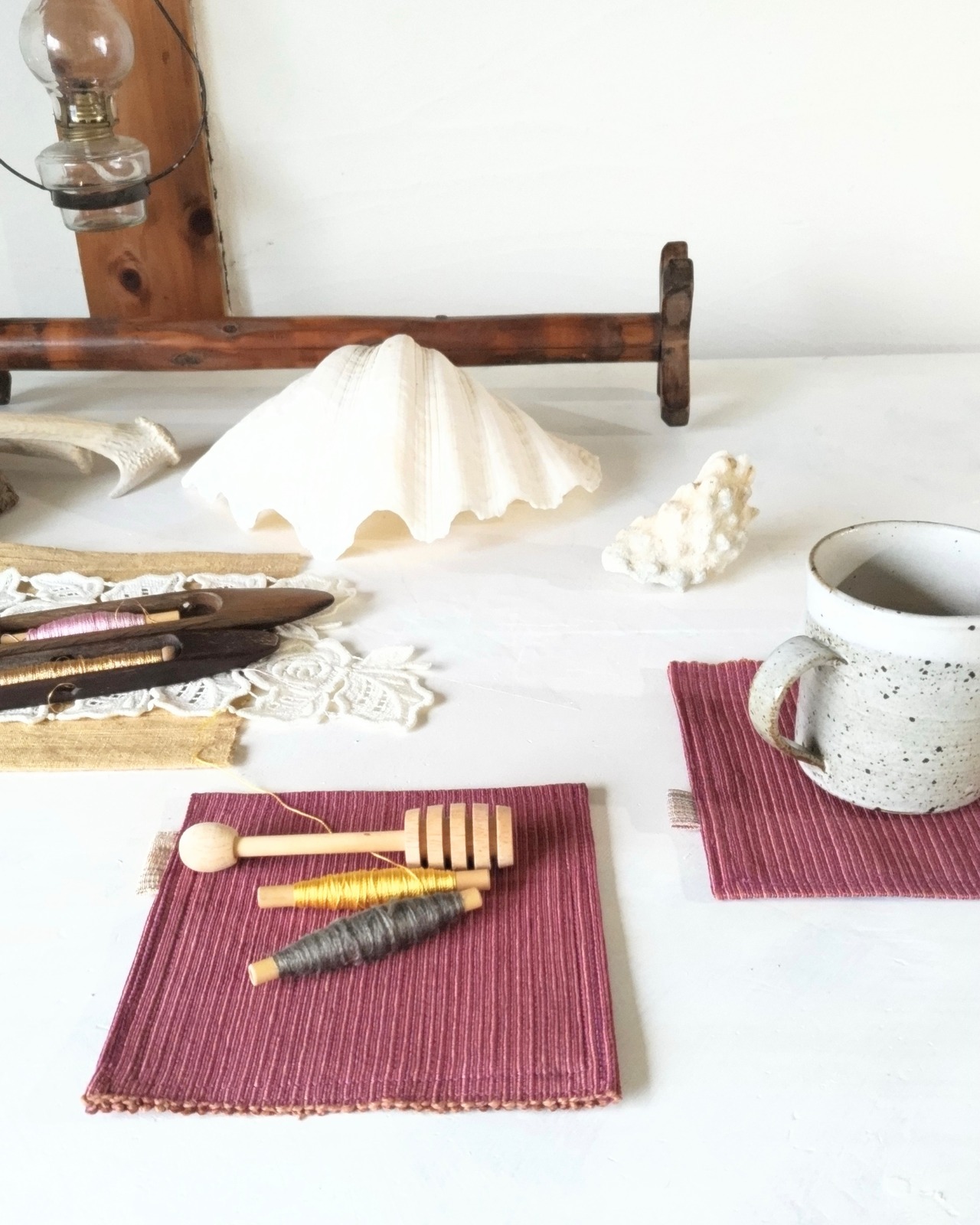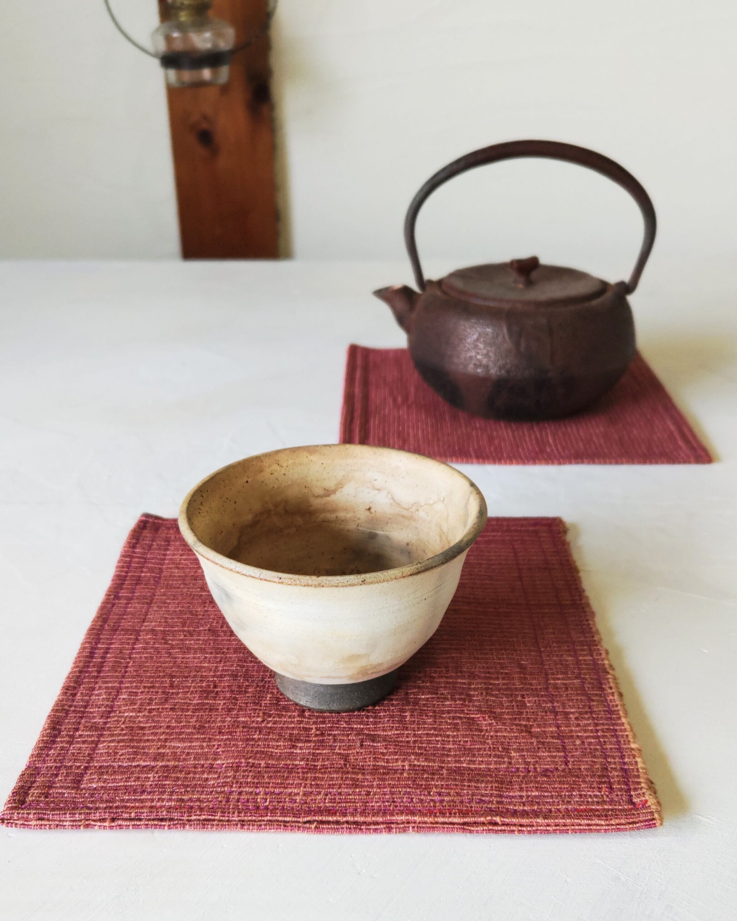織るのに使用した和機は、新潟県十日町市の機大工の元で出逢い、大阪まで来たご縁の深い織り機です。作られて100年以上は経過したスス光りしている和機でトントンと手織りした布を、使いやすいポットマットの形に仕立てました。
